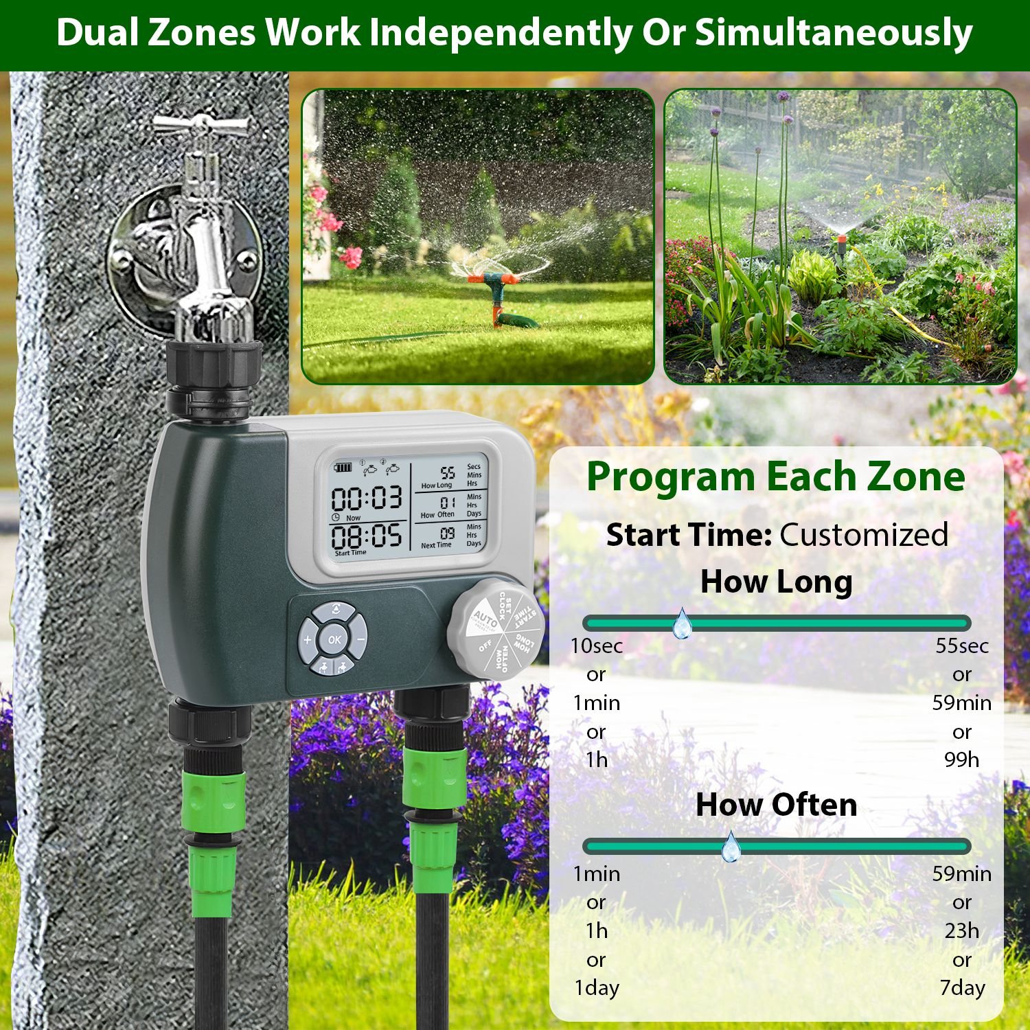 Watering Time Adjustment: 10-55second/per 5seconds, 1-59min/per minute, 1-99hours/1hour